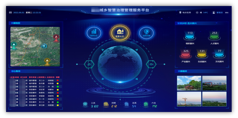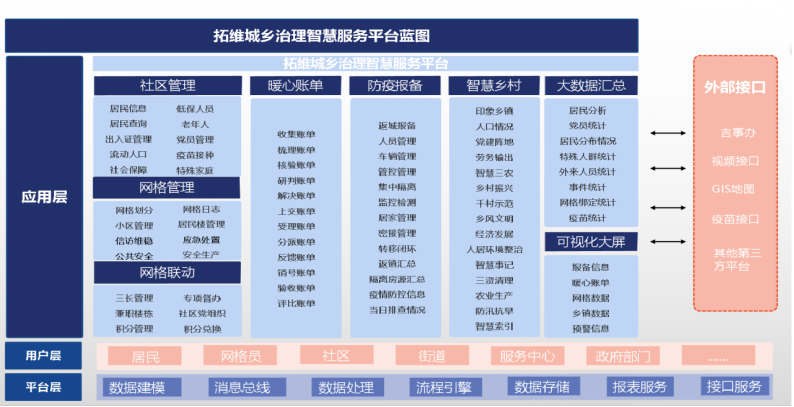 核心功能板块:社区管理、网格管理、网格联动、暖心账单、智慧乡村、大数据汇总、可视化大屏、事件上报管理等。