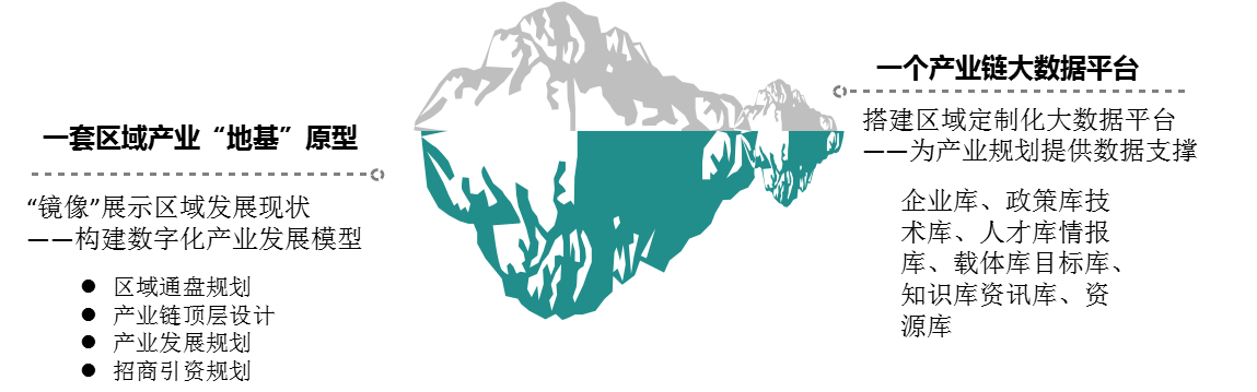 打造一套线上化、数字化产业发展模型,通过区域尽调,建立区域产业发展“地基”原型,镜像展示区域整体产业发展现状,通过区域通盘规划+产业链顶层设计+产业链数据库+产业发展规划,为区域搭建完备的产业发展模型。
