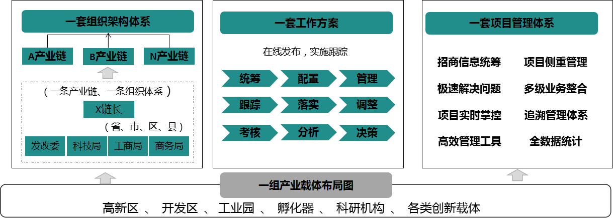 按照“一条产业链、一个工作专班、一套工作方案”模式,构建“一套组织架构体系+一套工作体系+一组产业载体布局图+一套项目全流程管理平台”的综合管理平台。