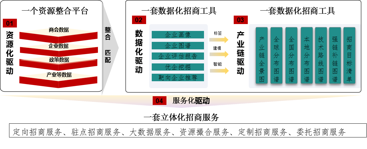 从平台搭建、数字化招商工具到产业图谱制作,再到全面立体的产业招商服务,打造四驱策略——产业链驱动、数据化驱动、资源化驱动、服务化驱动。