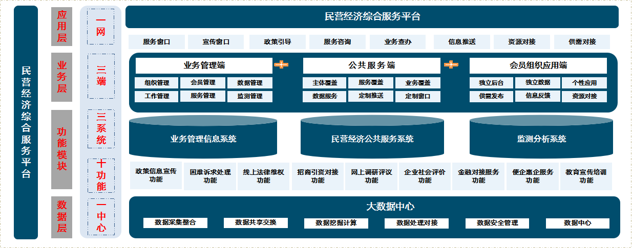构建“一网、三端、三系统、十功能、一中心”架构体系,运用数字化手段及优势,为民营企业提供多方面的具体服务,引导民营企业贯彻新发展理念,加强自主创新,加快转型升级和提质增效。