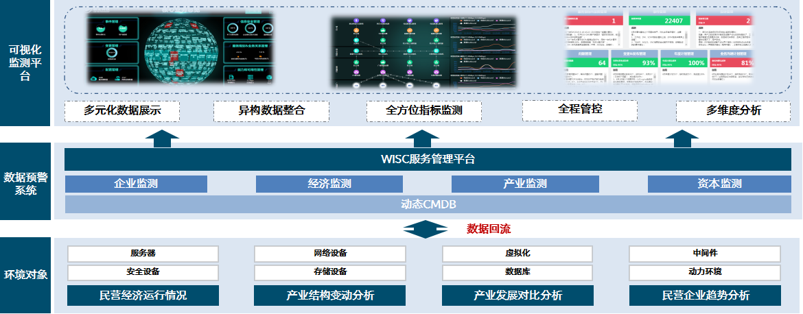 通过大数据分析和可视化技术,呈现民营经济运行态势,辅助党委政府决策。以数据流沉淀掌握企业综合行为、判断企业意向,形成有依据民营经济发展趋势。