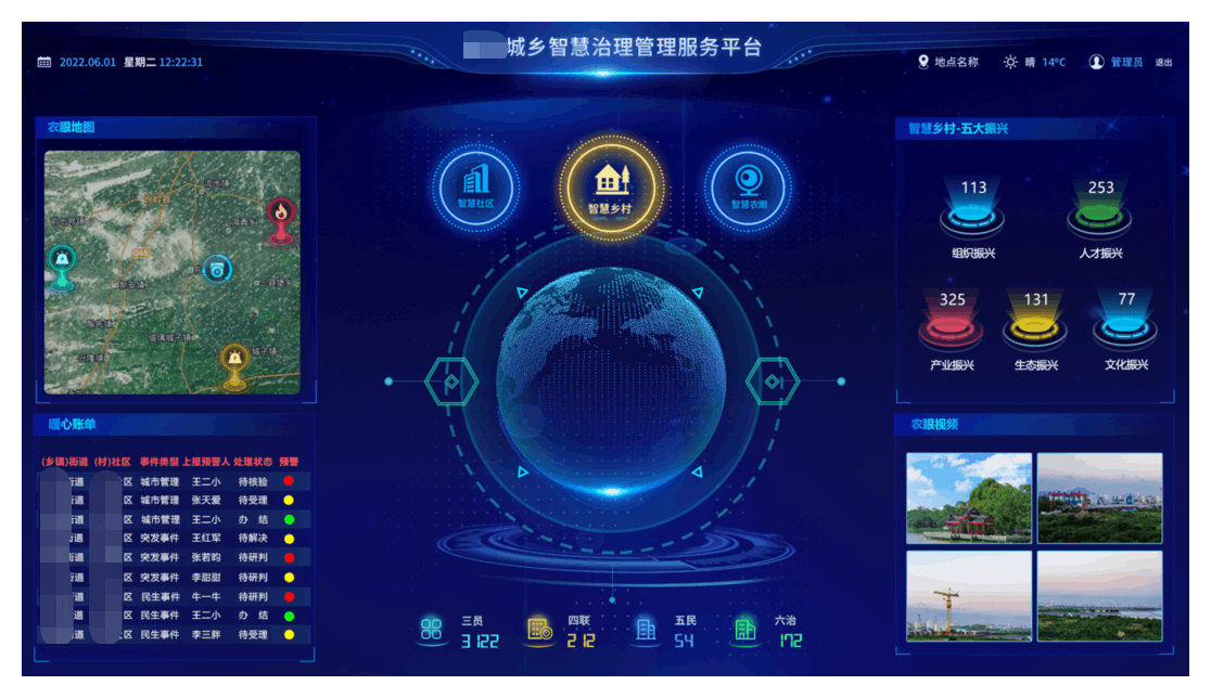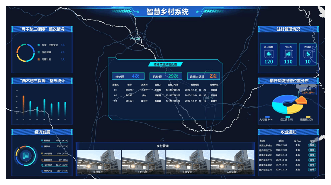智慧乡镇信息融合管理,两不愁三保障、村事村情、五大振兴、驻村干部管理一平台统管,支持乡村振兴工作,便捷一线干部工作开展。