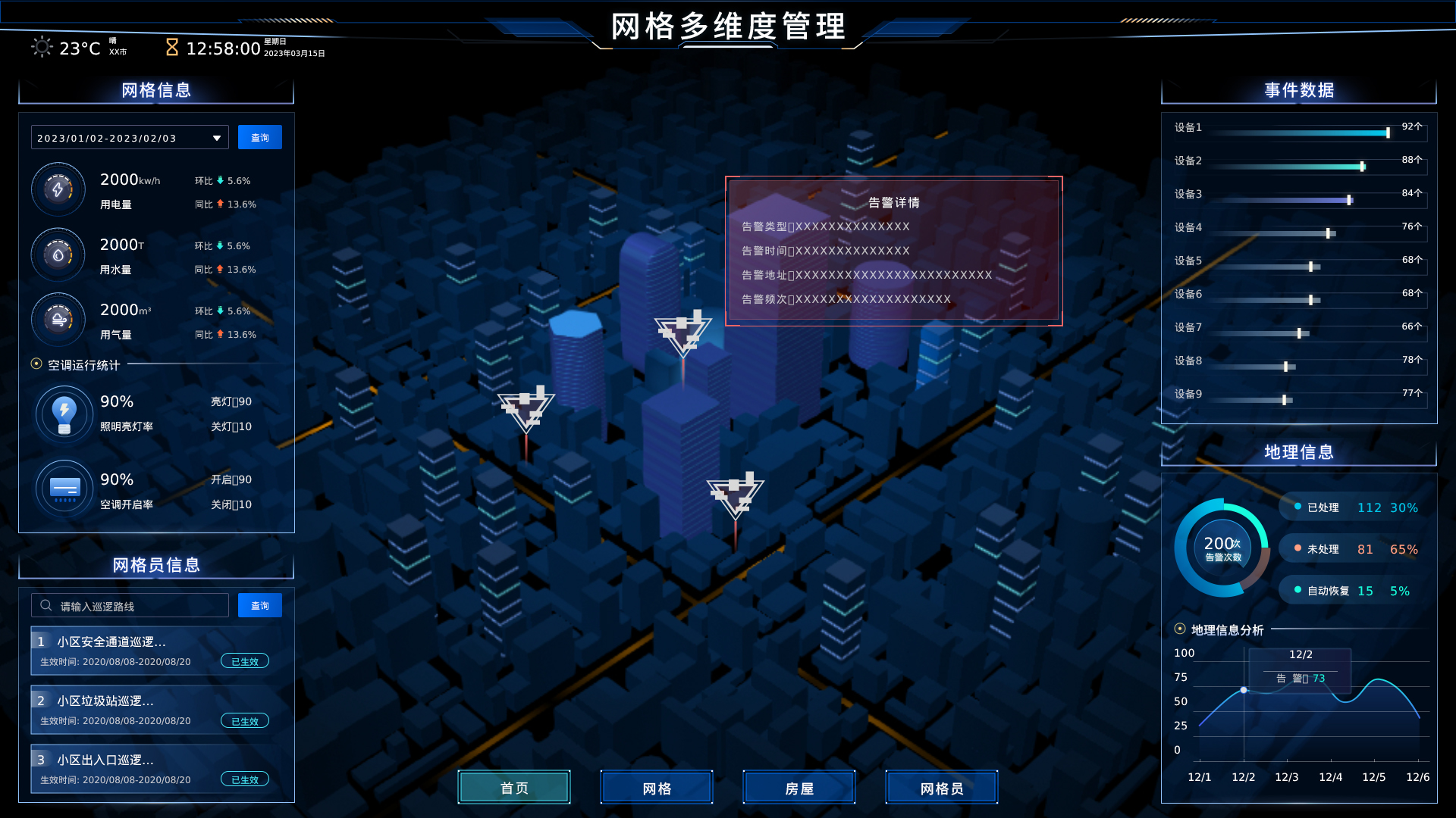全域地图网格多维度管理,运用新一代三维GIS技术,将网格、房屋、地理信息、网格员(人)、事件数据进行多维地理信息形式展现,一图撑握辖区全要素,提升指挥决策能力
