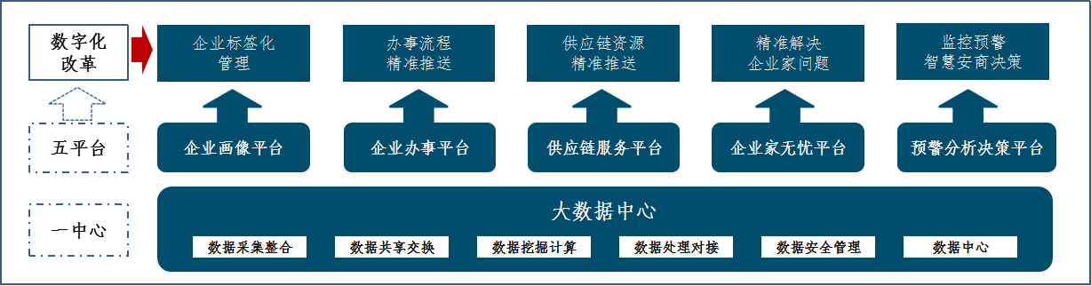 构建“1+5”架构体系,运用数字化手段及优势,整合资源,打造一个系统化、精准化的营商环境优化体系。